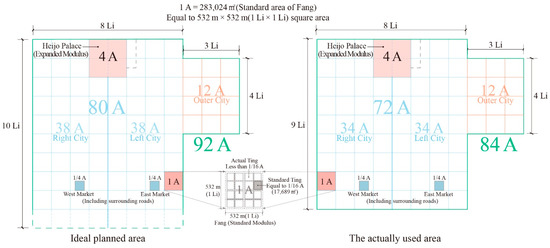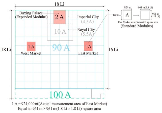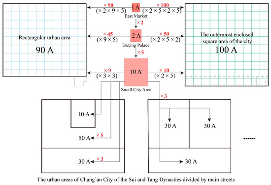 - In terms of land use management in Chang’an City of the Sui and Tang Dynasties, there is a very strict area planning method, which sets the area modulus (minimum unit) and consciously ensures that the area of each area conforms to the integral multiple of the modulus value A. This practice of dividing urban areas may be influenced by the “well field system” (a system of dividing land into several square plots of equal size and distributing them to different people) and related ideas that had developed since the Zhou Dynasty [40]. This is an effective way of controlling urban land resources. Specifically, if the area of the East Market is taken as the modulus, the area of the whole scope of the city is 100A. Meanwhile, the total area of the rectangular urban area is slightly smaller than 90A (88.84A), which is equivalent to removing the southernmost cells from the standard grid of squares. The size of the area modulus A is 924,000 m2 (equivalent to the square area of 961 m × 961 m); 1 Li (里) in the Sui and Tang Dynasties is generally believed to be 530~540 m, so the area modulus was probably designed in accordance with the square area of 1.8 Li × 1.8 Li, and the whole city area is equivalent to the square grid of 18 Li × 18 Li. If the total area of the rectangular urban area is measured according to the square grid of 18 Li × 16 Li (Figure 7), it is equivalent to 88.84A, which is exactly consistent with the measured value. This shows that the urban designers not only considered the total area value but also accounted for the fact that the city’s side length should conform to the length of the integral multiple of the Li. In addition, the objects most likely to be used as the area modulus are the East Market and Daxing Palace, the area ratio of which is very close to 1:2 (98.71%). The ratio of the area of the West Market, which is a little larger than the East Market, to the area of Daxing Palace is also close to 1:2 (coincidence: 97.95%). These phenomena show that in the initial design, the areas of East Market and West Market were intended to be equal, and they were set as the area modulus (A) of the whole capital city. The area of Daxing Palace is twice that of the market as the expanded modulus (2A); the area of other areas of the city should be determined on this basis. Moving from the Eastern Market area (1A) to the Daxing Palace area (2A) to the small city area (10A) is achieved by the constant integer multiple magnification of the area modulus. After the magnification of different integer multiples for the three areas, the rectangular urban area (90A) and outermost enclosed square area (100A) of the city can be generated, and the area of the urban area divided by main streets (such as 30A, 50A) also emerges, so that the whole city becomes a complete logical system (Figure 16). From the perspective of governance needs and convenient operations, the area planning of ancient capital cities may precede the shape design to solve the key problem of resource allocation; then, the spatial position of each functional block is determined through geometric shape design (the problem can be solved by the square and circular graphic operation method [28]). These findings suggest that the design of Chang’an City is complex and was obtained after comprehensively considering all kinds of issues.