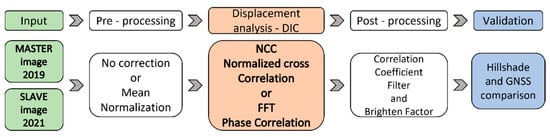 DIC is an optical-numerical measurement technique that can be employed to find and quantify movements through multitemporal digital imagery []. This technique implements algorithms that geometrically align two or more images of an area (the older image defined as the master and the more recent one defined as the slave) obtained during different periods []. Displacements are calculated by assessing the internal misalignment through a moving template window that compares master and slave images taken before and after a certain deformation event. DIC usually allows the measurement of displacements without the installation of any sensors or reflectors in the investigated area; thus, it can be considered as a fully remote measurement system [].