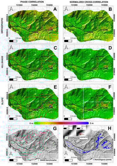 Displacement maps related to the evolution of the Corvara landslide during the 2019–2021 period. (A) PC-OPH. (B) NCC-OPH. (C) PC-HSD. (D) NCC-HSD. (E) PC-SLOPE. (F) NCC-SLOPE. (G) Distribution of GNSS benchmarks measured by the Forestry Department during the 2019–2021 period. (H) Position of homologous ground features recognizable on the hillshade of 2019 and 2021. Red arrow indicates the movement direction (analysis carried out using IRIS software, developed by Nhazca S.r.l.). Coordinate system: WGS84 32N.