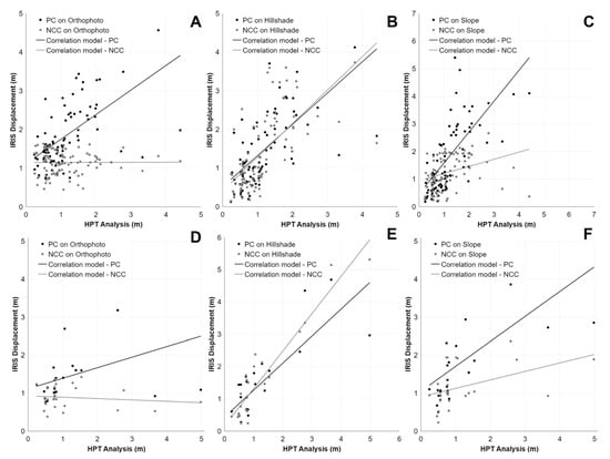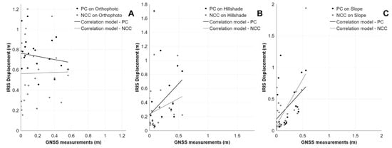 On the other hand, OPH datasets, despite the high resolution, proved to be the least effective for the analysis of movements, especially with NCC. With respect to the quantitative assessment of movements, PC tends to compute larger movements than NCC with any of the adopted datasets. For instance, as shown in Figure 4, movement rates of 94 HGF located in the S2 zone calculated with PC mainly range between 0.5 m and 4 m, while movements rates calculated with NCC range mainly between 0.5 m and 2.5 m (Figure 4A–C). The same pattern can be recognized in the plots representing movement rates calculated in 25 HGF along the track zone (Figure 4D–F). Overall, compared to HPT values which mainly reach 2–3 m, both algorithms tend to overestimate movements. Despite this, the best correlations are obtained with NCC application (Figure 4B,E). As previously stated, another assessment of DIC results was conducted comparing the calculated displacements with 22 GNSS benchmarks. In general, quantitative correlations are poor for any kind of algorithm–dataset combinations: GNSS measurements range from 0 to almost 0.7 m while DIC results mainly range between 0.1 m and 1.2 m, retaining the tendency of overestimating displacements. Nevertheless, among the three plots in Figure 5, the best correlation is reached firstly with the SLOPE dataset (Figure 5C) and secondly with the HSD one (Figure 5B).