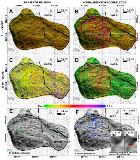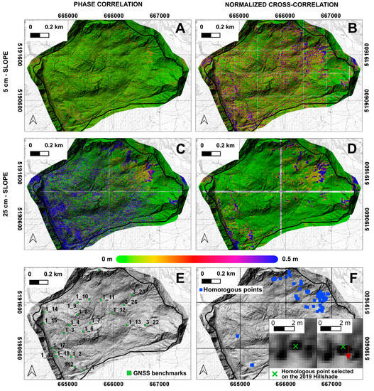 Displacement maps related to the evolution of the Ganderberg landslide during the 2019–2021 period. (A) PC-SLOPE-1. (B) NCC-SLOPE-1. (C) PC-SLOPE-2. (D) NCC-SLOPE-2. (E) Distribution of GNSS benchmarks measured by Helica S.r.l. during the 2019–2021 period. (F) Position of homologous ground features recognizable on hillshade of 2019 and 2021. Red arrow indicates the movement direction (analysis carried out using IRIS software, developed by Nhazca S.r.l.). Coordinate system: WGS84 32N.