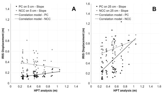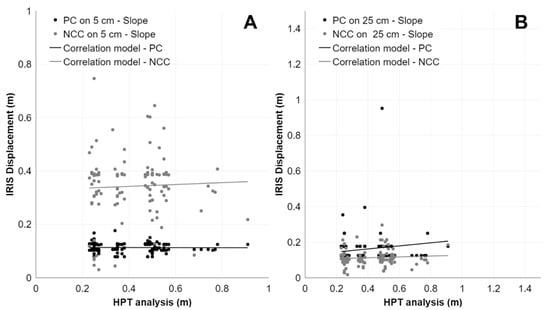 Scatter plots representing the correlation between PC and NCC applied on Ganderberg SLOPE and measurements of homologous points (HPT analysis) with different dataset resolutions. (A) PC-SLOPE-1 (R2: 0.21, RMSE: 0.37); NCC-SLOPE-1 (R2: 0.01, RMSE: 0.30). (B) PC-SLOPE-2 (R2: 0.20, RMSE: 0.31); NCC-SLOPE-2 (R2: 0.14, RMSE: 0.29).