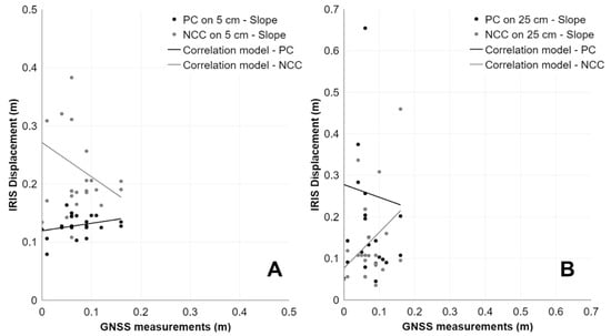 Scatter plots representing the correlation between PC and NCC applied on Trafoi SLOPE and GNSS measurements with different dataset resolutions. (A) PC-SLOPE-1 (R2: −0.11, RMSE: 0.08); NCC-SLOPE-1 (R2: −0.06, RMSE: 0.10) (B) PC-SLOPE-2 (R2: −0.02, RMSE: 0.11); NCC-SLOPE-2 (R2: −0.10, RMSE: 0.04).