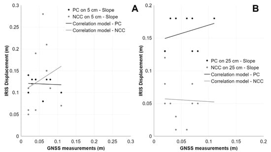 Scatter plots representing the correlation between PC and NCC applied on Ganderberg SLOPE and GNSS measurements with different dataset resolutions. (A) PC-SLOPE-1 (R2: 0.04, RMSE: 0.07); NCC-SLOPE-1 (R2: −0.004, RMSE: 0.20). (B) PC-SLOPE-2 (R2: −0.04, RMSE: 0.12); NCC-SLOPE-2 (R2: 0.07, RMSE: 0.20).