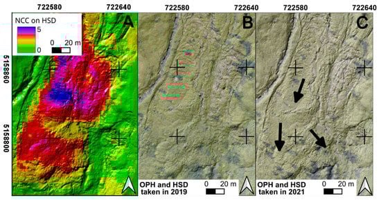 Focus on an active part of source zone S2 in the Corvara landslide. Results are compared with features on the orthophotos. (A) Displacement map (HSD–NCC) obtained with DIC application. (B) 2019-OPH overlying 2019-HSD. (C) 2021-OPH overlying 2021-HSD with black arrows highlighting the movement (analysis carried out using IRIS software, developed by Nhazca S.r.l.). Coordinate system: WGS84 32N.