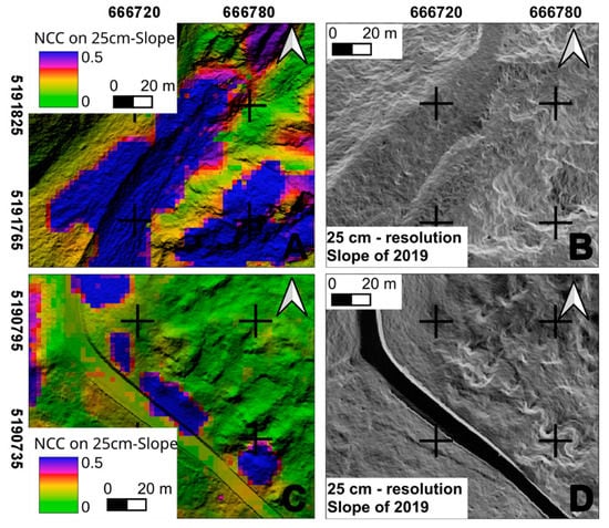 With reference to the Ganderberg landslide, a better result for the identification of moving areas was obtained by the application of NCC on SLOPE-2 (25 cm resolution) shown in Figure 6D, while the results with the SLOPE-1 dataset (5 cm resolution), in Figure 6A,B, were very scattered and difficult to interpret. The DSGSD dynamics affecting the entire slope was not detected due to the extremely low entity of displacement; on the other hand, scree slope activity, mainly caused by weather degradation, could be recognized. Two examples of results with SLOPE-2 are presented in Figure 13, giving an overview of what the algorithm works on. Figure 13A,B represent an area near a scree slope; here, NCC searches for slope angles contrasts that correspond to the alternation of greyscale colours that leads the algorithm to clearly identify movements but is not able to quantify it properly. Figure 13C,D represent an area of the national road SS 44bis, north of the little village of Hahnebaum, where the active parts identified by DIC are correlated with more continuous patches of SLOPE-2. In this case, NCC finds coherent intensity differences more easily, which mostly correspond to true displacements.