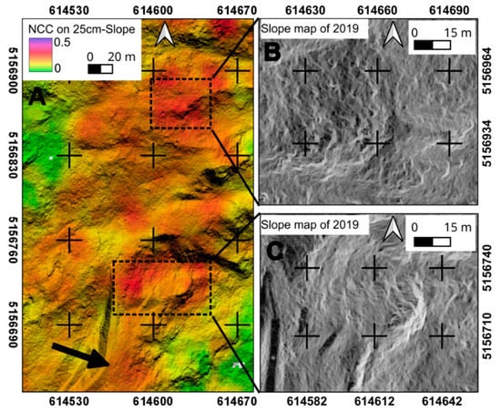 Examples of computed active parts in the Trafoi landslide. Results are compared with features on the SLOPE-2 dataset. (A) Displacement map (SLOPE–NCC) obtained with DIC application. The black arrow indicates the general south-east movement of rockslide. (B,C) show the features on which the NCC algorithm works in the slope map (analysis carried out using IRIS software, developed by Nhazca S.r.l.). Coordinate system: WGS84 32N.