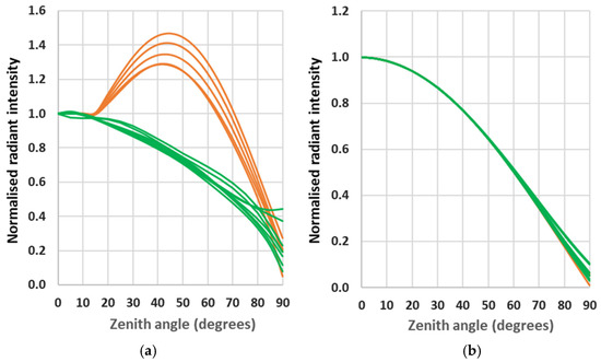 Azimuthally averaged radiant intensity results for the Dublin residential areas containing LPS lighting with plots in orange showing the results for the “Residential LPS 55 W” areas, and those in green showing the “Residential other” areas (see Table 2). In order to compare the areas, the radiances have been normalised to the zenithal emission in each case. Subfigure (a) shows the total (diffuse + direct) emission for areas containing primarily 55 W units with prismatic lenses, which contribute to excess emission in the upper hemisphere. Subfigure (b) shows the excellent agreement between all areas when only the diffuse (reflected) component is considered. For references to colour, see the on-line version of the text (Supplementary Materials).