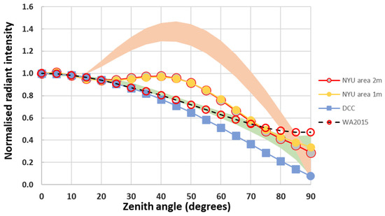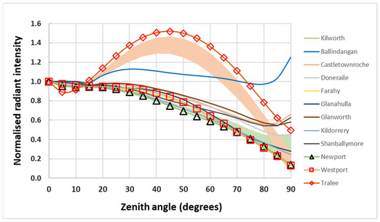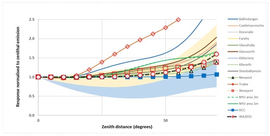 For comparison with the Li et al. fits, in Figure 4 we plot our model results in terms of radiance, i.e., with a correction for areal projection effects, consistent with the way data from the SUOMI or NOAA-20 VIIRS DNB instruments are processed and reported. Similarly, we restrict the plotted range to a maximum zenith angle of 70° for consistency with the range of reported satellite data. Plotted like this, a true Lambertian response will follow a horizontal line of unity as demonstrated, for example, by the case for the citywide diffuse-only model for Dublin (marked DCC in Figure 4). A reasonable upper limit is provided by the topmost line, which represents the results for the town of Tralee, modelled assuming the worst-case 55 W LPS lanterns. The plot shows that the majority of our results lie within the boundaries of the observed global low-rise areas, which suggests that our models have a generic application.
