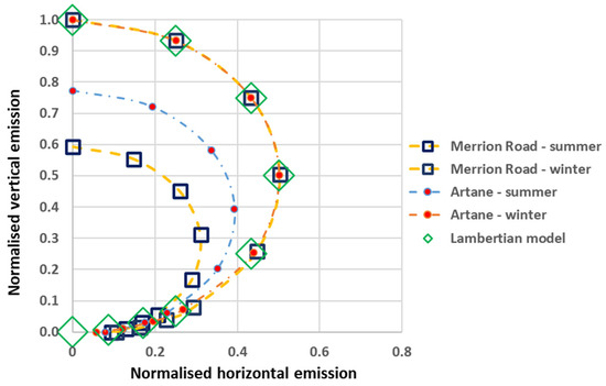 In Figure 5, we plot two extreme cases of behaviour due to seasonal effects, normalised to the winter zenithal emission in each case. The upper (winter) curves for both locations agree with a Lambertian model to a high degree, but there is a noticeable reduction of light output during the summer months, which differs between the sites. The region with the largest effect is a straight road with fully mature tree canopies up to 13 m high, while the lanterns are 10 m above the roadway—see Figure 6 for an illustration of the proximity of the tree canopies.