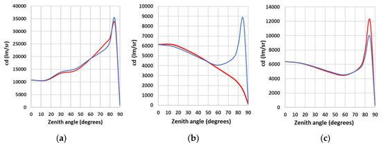 We updated our model to include a photometric angular dependence by incorporating OpenStreetMap data to determine the azimuth of the road segment closest to each light. A suitable change of reference then provides the C-angle appropriate to a viewpoint from due North, which is easily modified to deal with any given line-of-sight azimuth (see Appendix B). Finally, by referencing the specific photometric tables appropriate to each lantern, we can determine the appropriate value of direct emission in our calculations. In Figure 7, we present a set of plots of the calculated total emission (diffuse + direct) for both azimuthally averaged and azimuth-specific values of direct emission to illustrate a range of conditions. By comparing the plots, it can be readily seen that at zenith angles below roughly 60°, there is relatively little difference between the two approaches, but for larger values, there is a variation in behaviour which is dependent on the lighting distribution and the relative orientation of the line-of-sight. As expected, the housing estate case with a more random distribution of orientations (Figure 6a) is closest to the averaged values, but relatively large deviations (and in opposite senses) are found for the other two cases, which model single lines of streetlights.