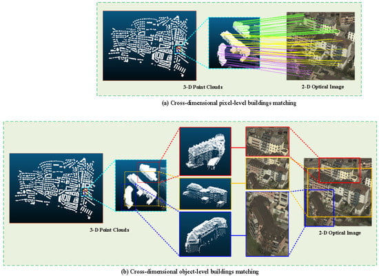 Figure 1b. Compared with pixel-level matching methods, object-level matching methods extract joint descriptors from the data containing global information of the targets and map them to the descriptor space for matching. The global feature extraction method, which focuses on the overall target effectively, alleviates the problem of fuzzy matching caused by the sparsity of point clouds, and the descriptor space solves the problem of attribute differences in cross-dimensional data, reducing the dependence of traditional image-based positioning methods on large amounts of image data. This concept provides new ideas for various fields, such as the precise self-positioning of drones in the state of control signal loss, urban management, smart city construction, high-quality building shape reconstruction, and so on. The core of this method lies in the choice of the descriptor space. By choosing a better descriptor space, one can obtain more accurate cross-dimensional matching results. The authors of [
