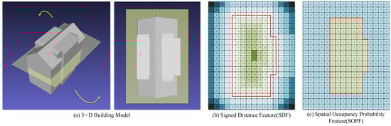 36] the Spatial Occupancy Probability Feature (SOPF) is used to describe the three-dimensional structure of the building, that is, the probability of the current sampling point being inside the model. Therefore, the SOPF of the sampling points outside the model surface is set to 0, and that inside is set to 1 (100%), as shown in