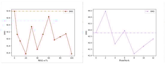 All experiments were carried out in the same environment. Training and testing of the network were conducted under Ubuntu 18.04. The hardware environment included a single Intel i7 9700 CPU, and the GPU acceleration used a single NVIDIA RTX 2080 Super with 8 GB of memory. In training, the batch size was 64, the Adam optimizer is used, the learning rate was set to 1 × 10−4, and the epoch was 1500. We conducted multiple sets of experiments under different hyperparameter setting conditions and judged the optimal hyperparameter settings according to the experimental results. The number of points sampled from the training models was 100,000, with a distance in the range of −0.3 to 0.3 (based on the normalized model).