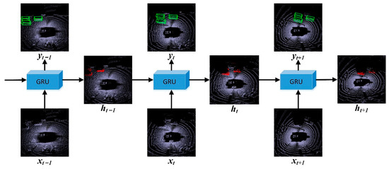 The GRU fuses the temporal feature process. At time , the current frame point cloud and the hidden feature of the previous frames are simultaneously input into the GRU. The GRU extracts the features of the current frame and combines them with the hidden features of the previous frames to predict the 3D objects in the current frame (green in the figure), and outputs the hidden features of the current frame (red in the figure) to the next GRU.