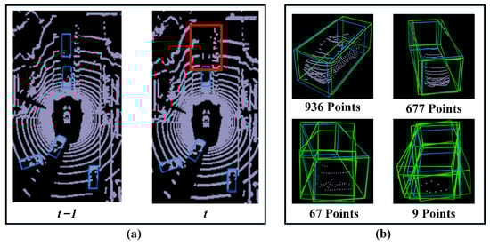The nuScenes point cloud dataset label visualization result. In the figure, gray dots represent original point clouds, blue boxes represent annotated bounding boxes, and green boxes represent potentially plausible ground-truth bounding boxes. (a) shows the case of label mismatch between two adjacent frames in the nuScenes dataset (object in the red box area is labeled in the previous frame and is not labeled in the current frame). (b) shows that each point cloud object may have multiple potential ground-truth bounding boxes with different sizes, shapes, and orientations, especially objects with very few points due to long distance and serious occlusion (the lower right position in the figure).