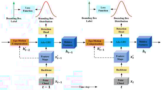 The framework of the method is shown in Figure 3. Firstly, the backbone extracts the feature of the current frame point cloud data , which are represented by . Then, the current frame’s feature and the previous frames’ hidden feature are jointly voxelized [31] to compensate for the inter-frame ego-motion. This means that the hidden feature of the previous frames is converted to the coordinate system of the current frame and is denoted as . Both and are input into the Ada-GRU for inter-frame feature screening and processing, and the hidden feature of the current frame is output. The hidden feature is input into the object detection head to generate the 3D object proposal of the current frame. At the same time, the uncertainty of the bounding box coordinate position is estimated. The Gaussian distribution function is used to establish a probability distribution model of the bounding box coordinates. The model predicts the Gaussian distribution mean and variance of each coordinate component of the bounding box. The mean represents the predicted value of the coordinate component, while the variance represents the localization uncertainty of each coordinate component. Finally, a new method for computing the object’s comprehensive score is proposed. The corresponding loss function is designed to optimize both the location uncertainty and the predicted value of the bounding box localization at the same time so as to improve the accuracy of the algorithm’s prediction of the bounding box localization.
