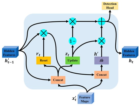 Ada-GRU: The Ada-GRU model is used to fuse the characteristics of the temporal sequence of the LiDAR point cloud frames, and the model structure and basic notation are shown in Figure 4. In the figure, represents the hidden features of the previous frames, accumulating the historical information over the temporal sequence. By utilizing the historical information, can provide a more comprehensive understanding of the point cloud frame at the current moment, enabling the model to better capture the dynamic changes and motion characteristics of the object. is the parameter of the reset gate, which has a value in the range of and serves as a scaling factor that controls how much information is retained by the hidden feature of the previous frames. The calculation method is as follows: