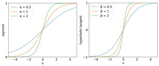 The sigmoid (left) and hyperbolic tangent (right) functions when the parameters take different values.