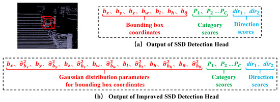 After fusing the temporal features of the point cloud, the detection head is used to generate 3D object proposals for the current frame. The SSD detection head [20] is commonly used, which can predict the center location , the size , the orientation , the category score , and the direction scores for the bounding box (shown in Figure 6a). However, the SSD detection head does not provide the prediction for the scores of the bounding box coordinates, so the uncertainty for the bounding box coordinates’ localization cannot be obtained.