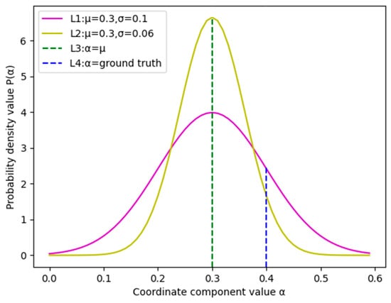 where is the mean value, is the variance, and is the possible value of each coordinate component of the bounding box. The seven coordinate components (i.e., ,,,,,, and ) of the transformed coordinates and the corresponding variances of the Gaussian distribution (i.e., ,,,,,, and ) are substituted into the above formula, respectively, to obtain the probability distribution of the seven coordinate components. Figure 7 illustrates an example of the model’s prediction for the bounding box coordinate component. The horizontal axis represents the value of the coordinate component, and the vertical axis represents the probability density. L1 and L2 are the two Gaussian probability density function curves predicted by the detection head. Each curve represents the probability density when the coordinate component takes any value of . When is equal to the predicted value (L3) of the coordinate component, the probability density reaches its maximum. In addition, when is ground-truth, its probability density value can reflect the prediction error. For example, the predicted values of L1 and L2 are both 0.3, while the variance of the L1 prediction is relatively large, and the uncertainty of the L1 prediction coordinates is relatively large. When the ground-truth value is 0.4 (L4), there is a significant difference with the predicted value, indicating a higher level of uncertainty, and it is evident that the prediction error of L1 should be smaller than that of L2 in the calculation. By calculating the error between the predicted value and the ground-truth (both 0.1), it is impossible to distinguish whether L1 or L2 is better. However, the probability density can distinguish between them. This property of the probability density function can be utilized in the calculation of the loss, as discussed in Section 3.5.