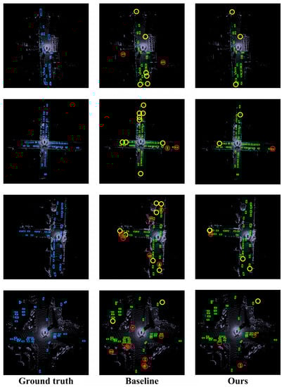 The visualization result of the 3D point cloud object detection is shown in Figure 8, which shows the impact of our proposed method on the baseline. It can be seen that the 3D point cloud object detection algorithm proposed in this paper has more precise detection results, which is based on the temporal information fusion and location uncertainty estimation. The yellow circles mark the missed detection objects. Comparing our method with the baseline, it is evident that our approach has fewer missed detections. This improvement can be attributed to the utilization of the temporal sequence information fusion, which leverages the object motion state information such as the trajectory and speed to enhance the detection performance. The red circles mark the false positive objects. The main reason for the significant reduction in false positives in our method is the incorporation of the localization uncertainty estimation. This enables the removal of the surrounding boxes with a high localization uncertainty during the post-processing stage, resulting in an improved localization accuracy.