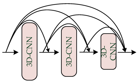 The convolution process of the 3D convolutional layer is shown in Figure 3. The input is feature maps with a size of , and after 3D-CNN layers with a certain convolution kernel size, feature maps with a size of are generated. The ith output of the (k + 1)th 3D-CNN layer is expressed as:
