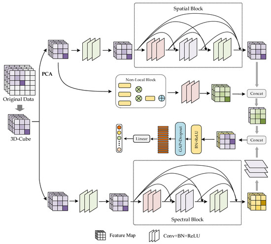 In the spatial branch, the original image samples are processed to a size of 145 × 145 × 100 by PCA, which reduces the amount of calculation and the number of model parameters while retaining the main information. Then, the image is split into training samples with a size of 9 × 9 × 100. In the local information extraction module, each 9 × 9 × 100 image sample is first convolved into a feature map with 24 channels and a size of 9 × 9 × 1 through the convolution layer and then input into the spatial block that consists of three layers. The convolution kernels are arranged in descending order according to their sizes, which are 7 × 7 × 1, 5 × 5 × 1, and 3 × 3 × 1. Each convolutional layer is followed by a batch normalization layer and a ReLU [38] activation function, and finally, a feature map with a channel number of 60 and a size of 9 × 9 × 1 is obtained. In the global information extraction module, the feature map with the same shape as the input is obtained through the non-local module and then input into the convolutional layer to obtain a feature map with a channel number of 60 and a size of 9 × 9 × 1. After the global and local information in the image samples is extracted by the two modules, the feature maps of the two parts are concatenated to obtain the spatial feature maps. The specific implementation details of the spatial branch are given in Table 1.