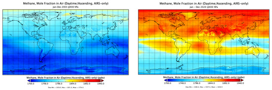 The CH4 time series from nearly two decades (2003–2020) of AIRS v7 retrievals [12,58,64,65] were analyzed in this study. As described in previous Section 2.2, the AIRS methane retrievals are broadly sensitive in the range between 850 hPa and the lower stratosphere, with peak sensitivity around 300–400 hPa, depending on surface and atmospheric conditions. Figure 2 displays annual mean global maps of satellite-retrieved CH4 at 400 hPa for 2003 (left panel) and 2020 (right panel). The maps show similar patterns of the global CH4 distribution, such as higher concentrations over the northern hemisphere (NH), the large-scale transport of plumes from biomass burning over Africa and South America, and large industrial emissions over Asia. Global CH4 concentrations significantly increased over this time period, with the annual average in 2003 at ~1754 parts per billion (ppb) and ~1839 ppb in 2020. The total increase during this period was approximately 85 ppb, which represents a ~4.8% increase. For the same time period (2003–2020), the annual average of CH4 concentrations observed from the GML surface measurements is ~1777 ppb in 2003 and ~1879 ppb in 2020, which is roughly a 5.7% increase. The satellite CH4 concentrations from TIR sounders, which represent a broad layer roughly spanning 200–400 hPa [62], are lower than the GML in situ measurements as expected due to the latter’s proximity to the source regions. Note that while the recent versions of the AIRS algorithm (V7, and V6) have implemented improvements in methane retrievals over previous versions (V5 and earlier), there might still be artifacts in the retrievals due to uncertainties in surface emissivity (especially over land/snow/ice surfaces) and cloud contamination in the cloud-cleared radiances that affect the results presented in Figure 2. There are ongoing efforts to improve the AIRS retrieval algorithms [66].
