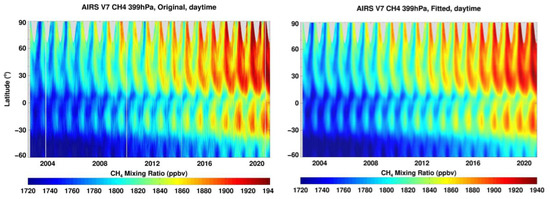 The evolution of CH4 zonal distributions is shown in the upper panels of Figure 3, where the top left panel shows AIRS measurements and the top right panel shows the same measurements but with fitting, as described above. Whereas globally the CH4 concentrations increased for all latitudes over time, stronger increases were observed in the NH in the earlier years, and beginning around 2008, the increases gradually expanded to the southern hemisphere (SH) and the Arctic region. The lower panels of Figure 3 show the rate of change calculated from the AIRS and CrIS TIR observations, where the bottom left and right are the deseasoned growth rates of AIRS and CrIS, respectively. The rate of change from AIRS also demonstrated the overall increase of CH4 after 2008, especially the increases that have been expanding toward the SH and polar regions. The results from CrIS for 2015 to 2020 show general agreement with those from AIRS for the same period. Since it takes approximately one year for CH4 to be mixed from the surface throughout the troposphere, the years with strong regional growth are usually followed by declines in the global background [72]. This pattern can be clearly seen from the early 2000s, but after 2014, the period of decline became less well defined and more dominant as seen by the overall positive increase rates. The satellite TIR results presented here are also generally consistent with those derived from in situ measurements [73].