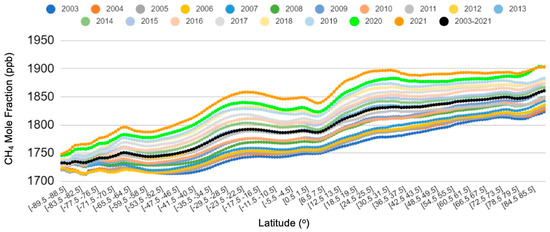 The zonal changes in CH4 concentrations have been discussed in previous studies [9,70]. CH4 concentrations are generally higher in the NH than the SH due to emission sources predominantly from NH land surfaces. The black curve in Figure 4 shows the averaged zonal mean variations from a 19-year average of AIRS CH4 data at 400 hPa (2003–2021). The lowest value (~1730 ppb, leftmost) is over the Antarctic region, and the highest value (~1858 ppb, rightmost) is over the Arctic region. The absolute CH4 Interpolar Difference (IPD: the difference between zonal averages calculated for 60–90°N and 60–90°S) for the period is ~128 ppb. The zonal means from each year from 2003 to 2021 are also shown in Figure 4. The increase in the South Pole region is the smallest, compared with increases in the other latitudes. The two largest peaks of the increases in Figure 4 are in the north and south subtropical zones.