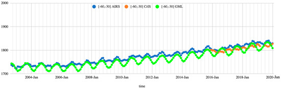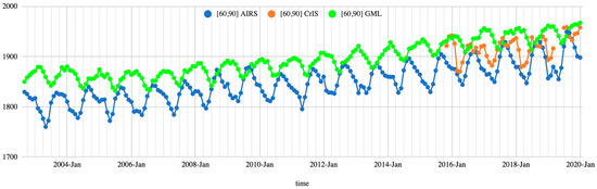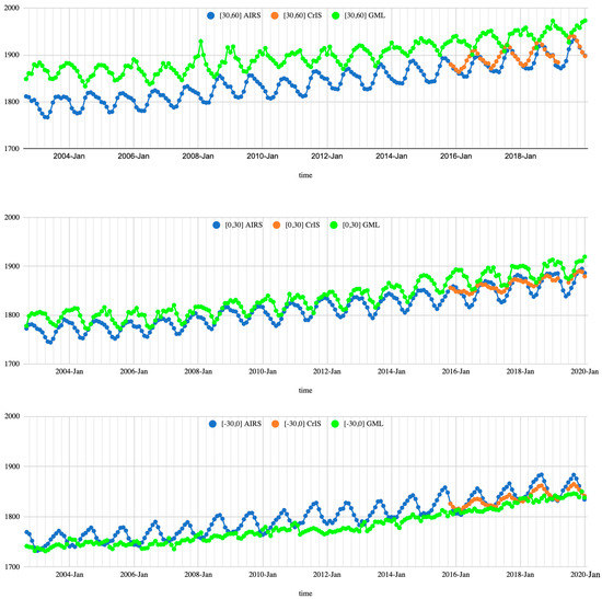 Time series of CH4 (in ppb) retrieved from AIRS (blue), CrIS (orange) at 400 hPa, and in situ measurements from NOAA GML (green) for different latitudinal zones: 60–90°N (top panel); 30–60°N (2nd panel); 0–30°N (3rd panel); 0–30°S (4th panel); 30–60°S (lowest panel).