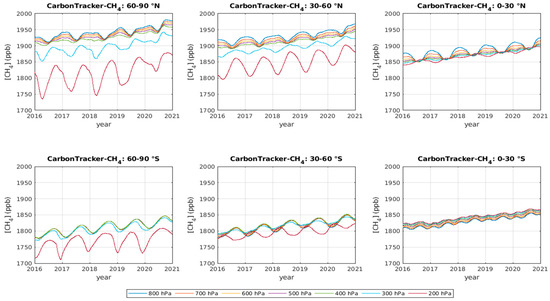 Pressure-altitude versus time cross sections of CH4 from CarbonTracker-CH4 from 2003 to 2020 for different zonal bands: 60–90°N (upper left); 30–60°N (upper middle); 0–30°N (upper right); 90–60°S (lower left); 60–30°S (lower middle); and 30°S–0 (lower right).