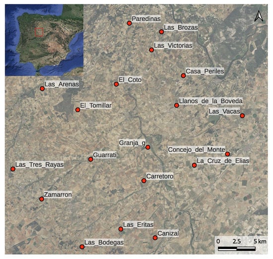 The study area is in central Spain, between the cities of Zamora, Valladolid and Salamanca (Figure 1). Here, a soil moisture monitoring network called REMEDHUS is operated by the Centro Hispano Luso de Investigaciones Agrarias (CIALE) of the University of Salamanca [21]. The REMEDHUS network is included in the International Soil Moisture Network (ISMN) [22], which is mainly focused on the distribution of harmonized and standardized data for the validation of remote sensing soil moisture products. Figure 1 shows the stations of the network providing data used for the present work. The extention of the area is 1285 km and the main land use is agriculture. In particular, more than 80% of the area is covered by rainfed crops such as wheat and barley [21], and the remaining part by irrigated crops (corn), vineyards, forest and pastures [23]. The area is flat with maximum altitude differences of 200 m, and the soil is mainly composed of sand with a low content of organic matter. The climate of the region is continental semi-arid mediterranean, with an average annual temperature of 12 °C and a mean annual precipitation of 385 mm [24]. The study period covers the irrigation season from April to October of the years 2018–2021.