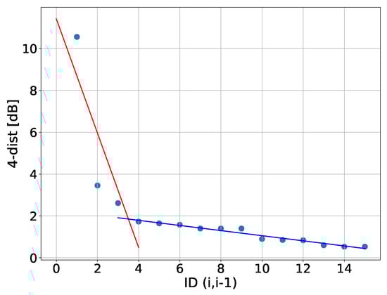 k-dist sorted graph with k = 4 for the 3D space of the differences of the features for the field 6 referred to the station of Carretoro for 2020. The blue line fits the points whose distance from the fourth nearest point is low, while the red line fits the points which are more distant from their fourth nearest point in the feature space, which the DBSCAN algorithm would classify as noise. The k-dist parameter is set equal to y coordinate of the intersection point between the blue and the red line.
