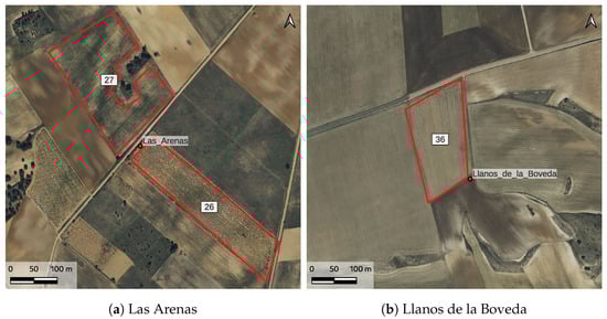 For every measurement station, one or more fields were digitalized by using optical images of all the 4 irrigation seasons under study. While doing that, it was noted that the shape of some fields changed during the study period upon agricultural season. For this reason, only the fields more stable in time were analyzed. Moreover, since the measurement stations are often at the border of the agricultural fields (see Figure 2), and the precision of their coordinates is not known, for almost every station more than one field was digitalized and analyzed. Figure 4 shows two examples of digitalized fields for two stations, namely Las Arenas (Figure 4a), where two fields were digitalized, and Llanos de la Boveda (Figure 4b) where only one field was digitalized.