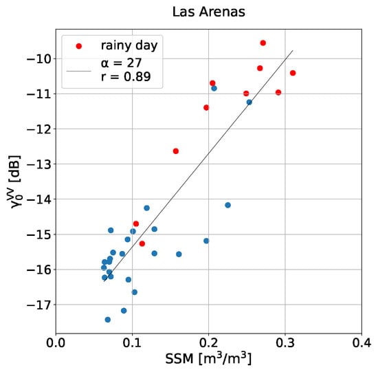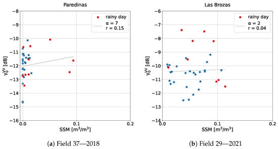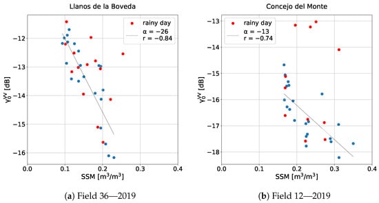 Figure 5 shows the direct relationship over the field 27 associated to the station of Las Arenas for 2018. As it can be observed in the plot, the precipitation events are especially associated with higher values of both and , but they are distributed also on lower values of soil moisture in the sample. A similar distribution of the rainy days can be observed in the graph referred to field 36 during 2019 (station of Llanos de la Boveda), reported in Figure 6a. Over this field, the relationship between the backscattering coefficient and the measured soil moisture is inverse. In Figure 6b it is reported another example of inverse distribution for the field 12 associated to the station of Concejo del Monte in 2019. Differently from the other fields, over field 12 it is possible to note that some of the dates associated with the precipitation events and high values of are isolated compared to most of the points. These points can thus be considered as outliers. Since other “inverse” fields of the analyzed dataset presented outliers associated with precipitation events, similarly to field 12, consistently it was decided to exclude from the analyses the data associated with precipitation events over fields with inverse relationship.
