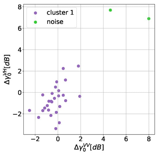 Figure 8 shows an example of application of the DBSCAN analysis on the differences of the SAR features over field 6 (station of Carretoro) for the year 2020. For visualization purposes, results are shown in a 2D plane of the features and , but the algorithm was applied in a 3D features space as illustrated in Section 3. Violet dots represent data classified as belonging to a cluster, while green dots, which are farther from the main cloud of points, are classified by the algorithm as noise.