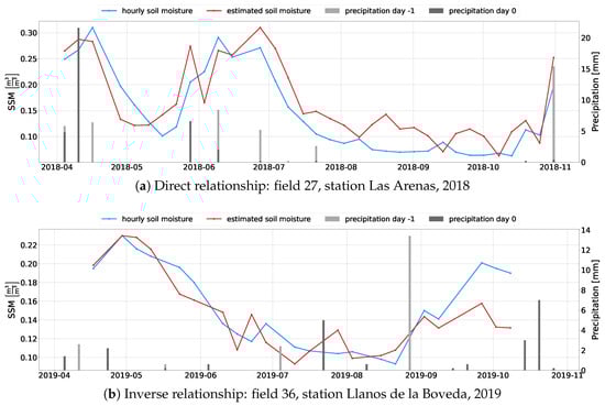 Time series of measured and estimated soil moisture reported respectively in light blue and red for two fields characterized by direct (a) and inverse (b) relationship between and . Precipitation is also depicted with grey bars.