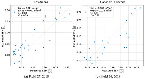 Figure 10a,b show the relationship between measured and estimated soil moisture for the two reference fields 27 and 36 respectively. In the image it is also reported in black the line where measured and estimated soil moisture have equal values: as can be observed, for both the fields the points are well distributed around this line.