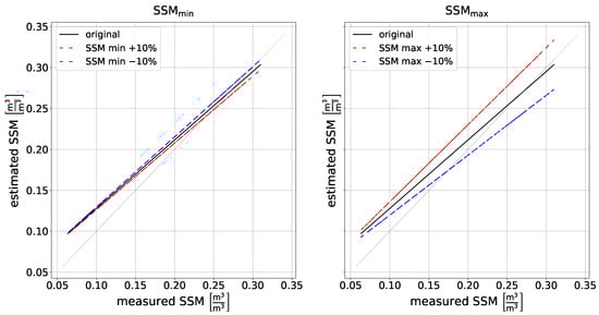 Effect of the variation of the in situ parameters on the lines interpolating the distribution of points on the plane measured—estimated soil moisture. The black line fits the distribution of the original solution, while the red and the blue dashed lines depict the line fitting the solution obtained by changing the parameters respectively of +10% and −10%. The grey line is characterized by slope equal to one. The tested parameters are the minimum and maximum value of in situ data for every field. This graph is referred to the field 27 of the Las Arenas station for the year 2018.