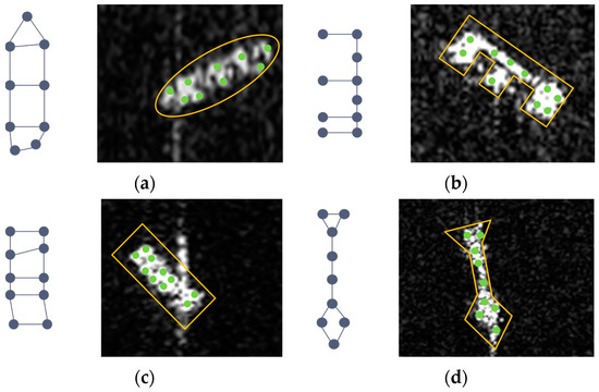 Irregular shape and topology of ship targets. The topology is represented by clusters of points, and the yellow lines represent the irregular shapes of ship targets. (a) represents an ellipse-like shape, (b) represents an E-like shape, (c) represents a rectangle-like shape, and (d) represents an arrow-like shape.
