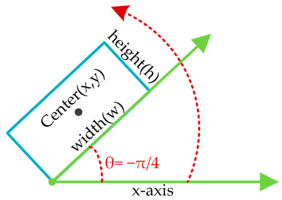 We designed a brand-new feature pyramid network, MT-FPN, to refine the features. This network uses MTM to enhance the representation ability with respect to the ship targets’ morphologies and combines the more accurate morphology features to fully extract inherent topological information for the ship targets. MT-FPN also performs a simple fusion of the features from each layer, enhancing the interaction of information between each layer to improve the multi-scale detection performance. Finally, the prediction head, RAFH, uses a parameter-sharing mechanism and a two-stage prediction strategy, reducing the complexity of the network while achieving feature alignment and differentiation processing to optimize the network’s performance further. In rotation offset prediction, we used the prediction of rotation box regression and the input feature map to align the features. In decoupled feature prediction, we refined the features to better complete the final classification and regression tasks. The anchor is represented by a 5-dimensional vector (x, y, w, h, θ) for both regression tasks, as shown in Figure 4. Here, (x, y) are the coordinates of the center point; (w, h) denotes the long and short sides of the rectangle; and θ is the angle between the positive x-axis and the long side, with a range of [−π/4, π3/4), where clockwise is positive and counterclockwise is negative. The classification task distinguished between targets and backgrounds in the predicted boxes.