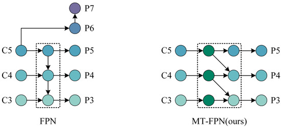 After obtaining the feature from the MTM structure, in order to ensure that the features extracted by the backbone network were fully utilized, we performed a cascading operation to aggregate with the original feature map , then used the result for feature pyramid network fusion: