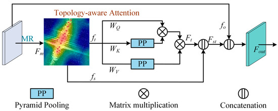 The architecture of the morphology and topology module (MTM). WQ, WK, and WV, respectively, represent the weights of the 1 × 1 convolution operation, and their purpose is to project features into low dimensions; PP represents the global average pooling operation of multiple scales; concatenation represents channel splicing, and convolution is used for channel adjustment.