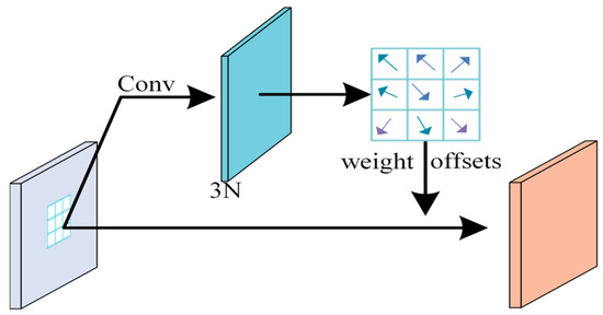 The enhancement of SAR images may yield unnatural data and cause model overfitting [49]. In addition, the shapes of ship targets in SAR images vary under different imaging conditions. Therefore, we used deformable convolution [31] to improve the ability to represent ship morphology after uniform channel adjustment (compressed to 128) on the output of the backbone network. This convolution was able to adaptively adjust the convolution kernel based on input features, thereby improving the detection performance of the model in the presence of rotation and multiscale targets and better capturing the diverse shapes of ship targets in the feature map. Specifically, deformable convolution calculates new sampling positions and weight coefficients through offset convolution for each feature point in the input feature map. Then, it performs convolution using the offset and weight. As shown in Figure 7, this convolution is implemented by adding a learnable offset layer before the traditional convolution layer, with a channel number of 3 × *N, where N represents the number of convolution kernels of the deformable convolution. The output offset is used to adjust the sampling position of the convolution kernel in the input feature map, while the weight ensures the effectiveness of feature extraction. This method improves the robustness of the network to geometric transformations, better matches the irregular shapes of ship targets in the feature map, and enhances the network’s representation ability for target morphology. The specific mathematical expression is shown below:
