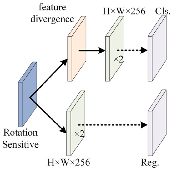 Architecture of decoupled feature prediction. Rotation sensitive means explicitly encoding the angle information on the feature channel; feature divergence means merging the angle information on the channel; cls. represents the classification subnetwork; reg. represents the regression subnetwork.