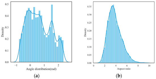 Distribution of rotation angles and aspect ratios of ship targets in the RSDD-SAR dataset: (a) represents the distribution map of ship angles; (b) represents the aspect ratio distribution map of the ships.