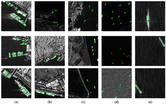 RSDD-SAR dataset examples of various scenes: (a) shows the dense arrangement scene; (b) shows the port scene; (c) shows the channel scene; (d) shows the low-resolution scene; and (e) shows the high-resolution scene.