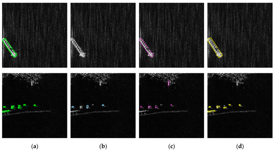 Table 5 shows the quantitative impact of each critical improvement on detection accuracy. This experiment aimed to evaluate the performance improvement of the MT-FANet model, including the design of the MT-FPN module and the rotation alignment feature head (RAFH). In the table, “√” indicates the presence of an improved module, and “×” indicates the absence of the module. The results show that with the addition of improvements, the detection accuracy of the network gradually improved. In the SAR ship target detection task, compared with the baseline network, the AP50 of MT-FANet increased by 6.56% (from 84.28% to 90.84%) and the offshore AP50 increased by 4.89% (from 90.83% to 95.72%). The detection effect of inshore AP50 improved even more significantly, with an increase of 11.32% (from 55.55% to 66.87%). In addition, we further illustrated the effectiveness of each step in the proposed method by providing the visualization results corresponding to each step. Figure 13 demonstrates the gradual improvement in missed and false detections of ship targets by introducing each essential improvement. Our method performed best in the detection of results, as shown in Figure 13d.